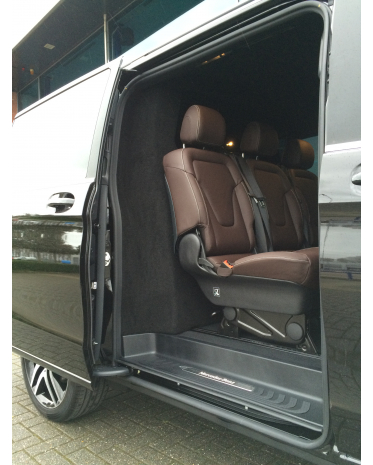 Grijs kenteken ombouw Mercedes-Benz Vito/V-klasse 447 WB 343 met rails bestaande uit: Separatiewand C-stijl voor- en achterzijde antraciet bekleed met ruit, afdekprofiel laadruimte t.b.v. originele rails in de vloer, blindering links binnenzijde, blindering links in kleur RAL9005 & opvulstuk bij een schuifdak uitvoering (alleen bij schuifdak, verplicht).