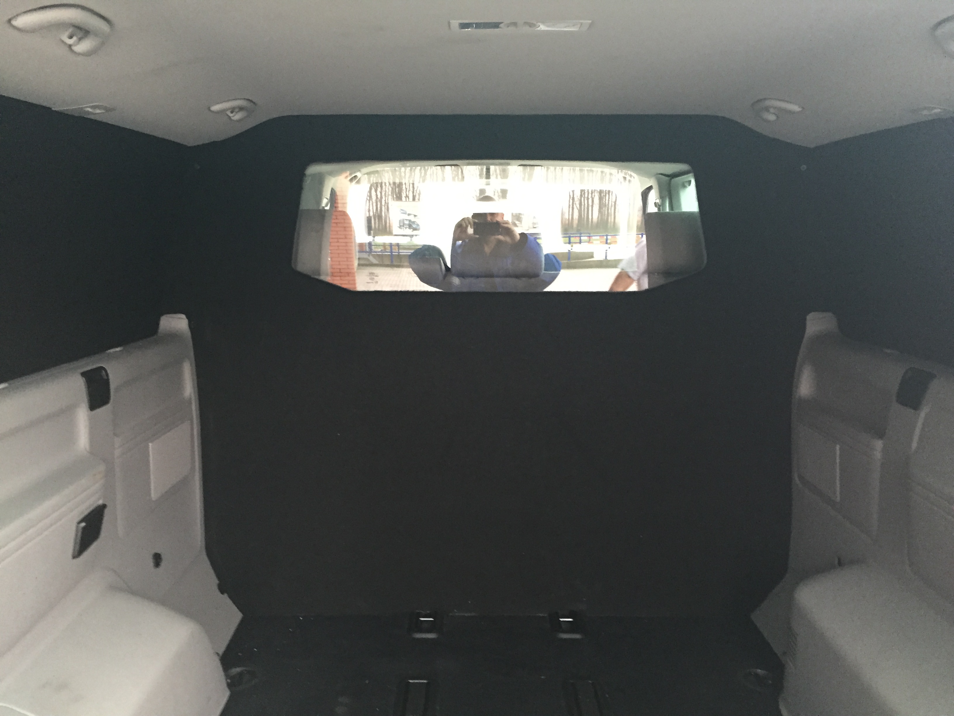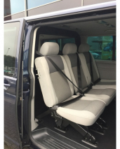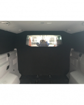 Grijs kenteken ombouw Volkswagen T5 / T6 Caravelle lange wielbasis bestaande uit: Separatiewand C-stijl polyester voor- en achterzijde zwart bekleed met ruit, blindering links in kleur RAL9005, blindering binnenzijde links.